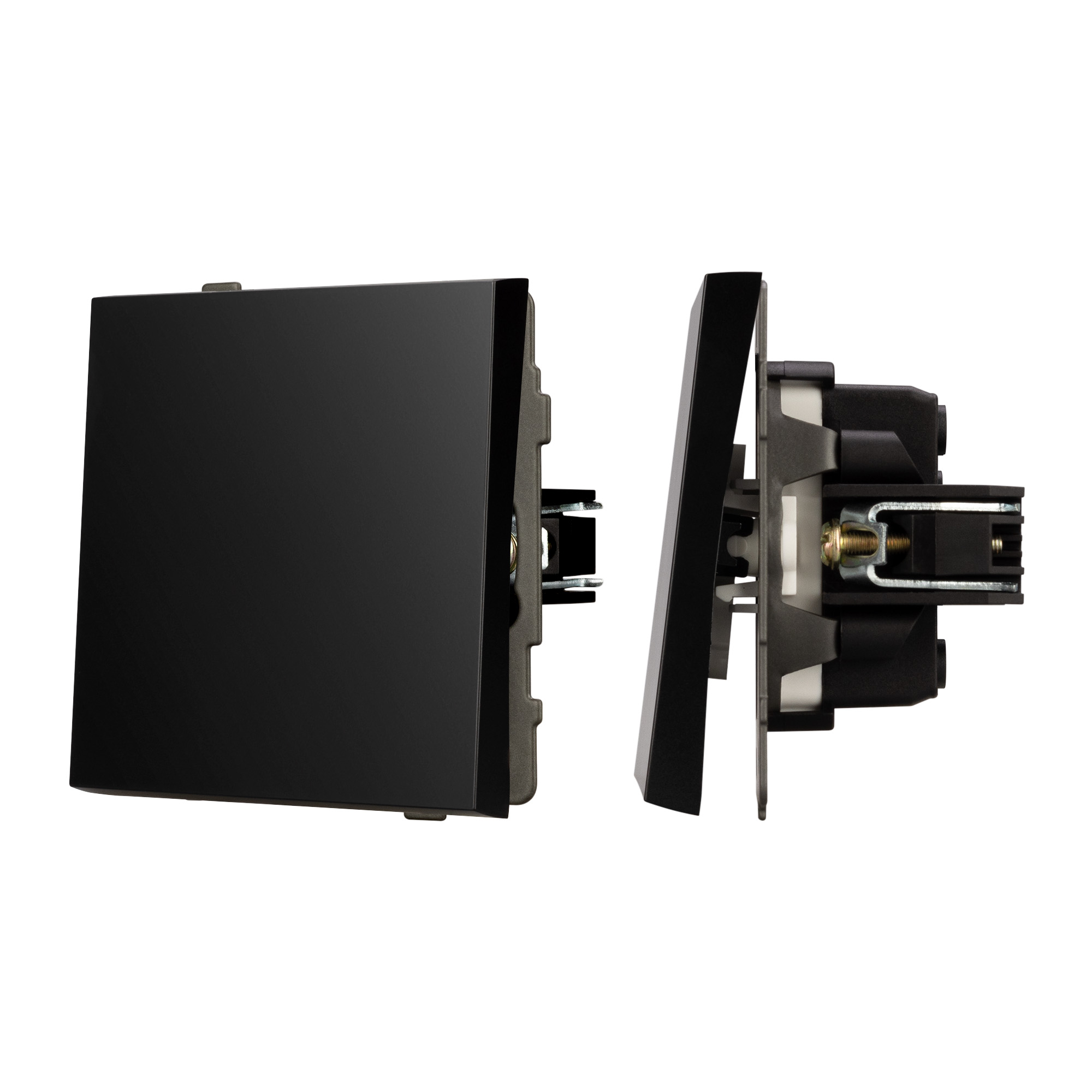 Механизм выключателя света клавишный на 1 пост 1 клавиша (проходной). Цвет - черный. Без фронтальной рамки. Уровень пылевлагозащиты IP20. Выключатель устанавливается в стандартный подрозетник круглого сечения диаметром 60мм.