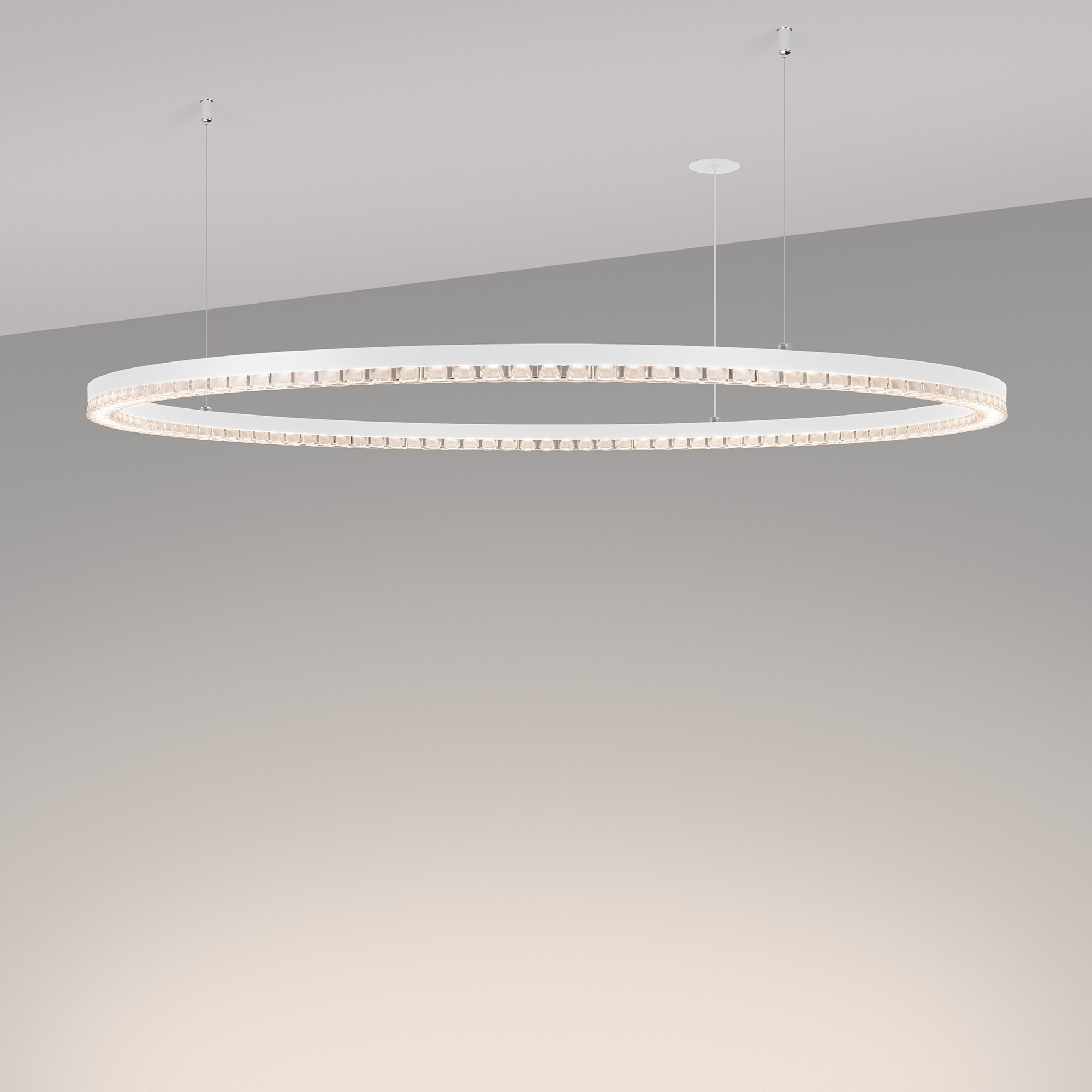 Под заказ. Подвесной светильник. Мощность 60 Вт, св. поток 5250 лм, 80-95 лм/Вт, дневной белый 4000 K, CRI>90, угол 45°, напряжение питания 230 В. Белый круглый корпус из алюминия, экран PMMA, степень защиты IP20. Размер: диаметр 1050 мм, высота 34 мм, ширина профиля 30 мм, размер чаши: диаметр 65 мм, высота 26 мм. Монтаж подвесной, длина подвеса 1200 мм, тип чаши встраиваемый, диаметр установочного отверстия чаши 60 мм. Драйвер (2 шт.) 9-42 В, 700 мА. Пульсация <0,3 %.