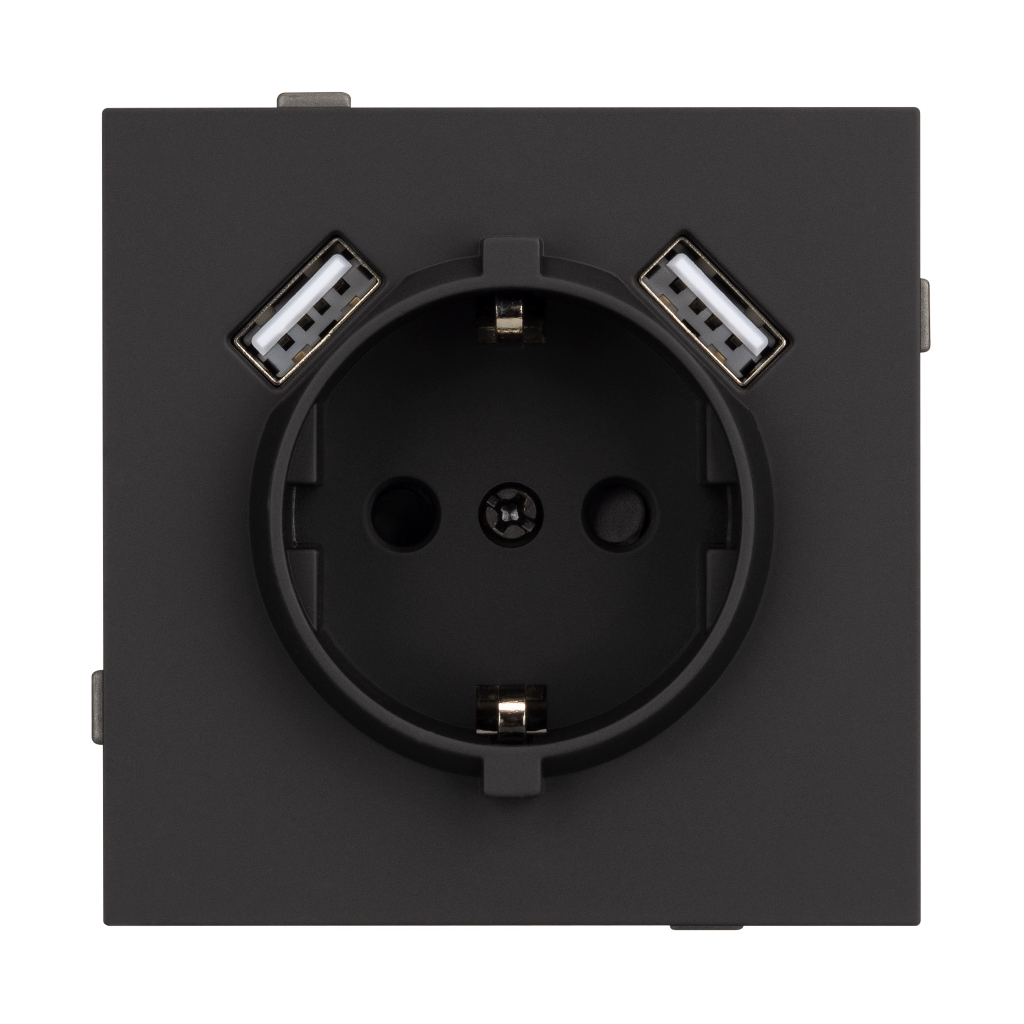 Механизм розетки с заземлением на 1 пост и 2USB Type A порта. Цвет - черный, с Soft-Touch покрытием. Без фронтальной рамки. Уровень пылевлагозащиты IP20. Розетка устанавливается в стандартный подрозетник круглого сечения диаметром 60мм. Габаритные размеры: длина 71 мм, ширина 71 мм, высота 53 мм. Гарантийный срок 10 лет.