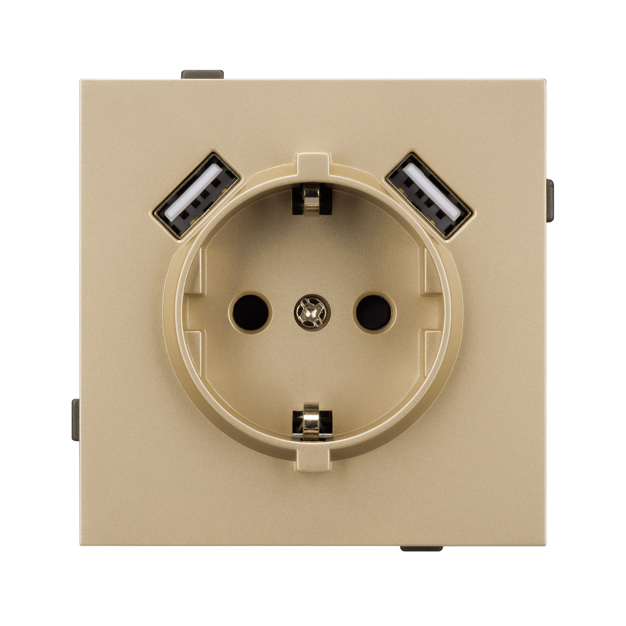 Механизм розетки с заземлением на 1 пост и 2USB Type A порта. Цвет - золотой, с Soft-Touch покрытием. Без фронтальной рамки. Уровень пылевлагозащиты IP20. Розетка устанавливается в стандартный подрозетник круглого сечения диаметром 60мм. Габаритные размеры: длина 71 мм, ширина 71 мм, высота 53 мм. Гарантийный срок 10 лет.