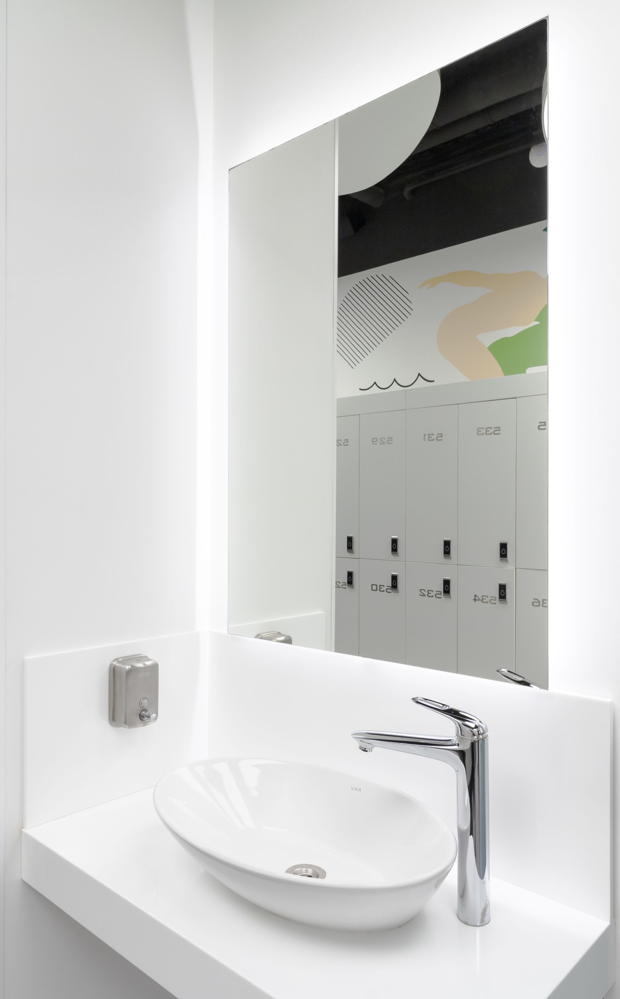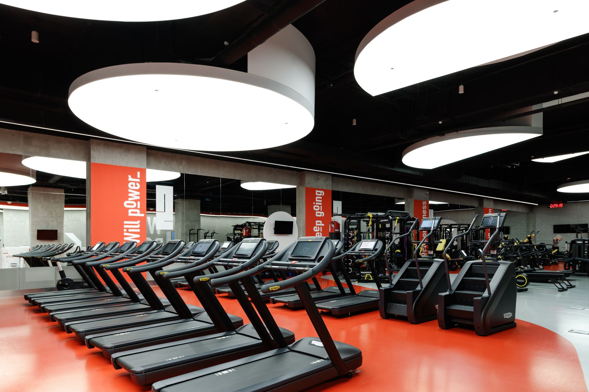 Световой дизайн построен на контрасте белого и красного, широких световых полос и тонких линий света. Линейные светильники с полупрозрачными экранами идеальны для основного освещения. Декоративная подсветка зеркал и других элементов интерьера выполнена светодиодными лентами дневного белого свечения. Границы потолка и стен в фитнес-зонах эффектно подчеркнуты линиями света.