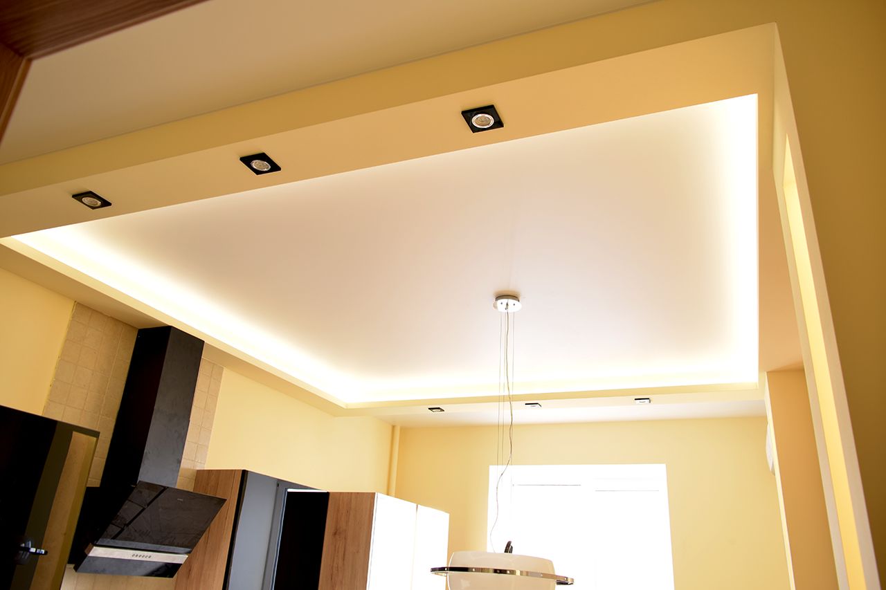 Дополнительное светодиодное освещение в многоуровневом потолке из гипсокартона. Зонирование помещения вертикальными линиями света.